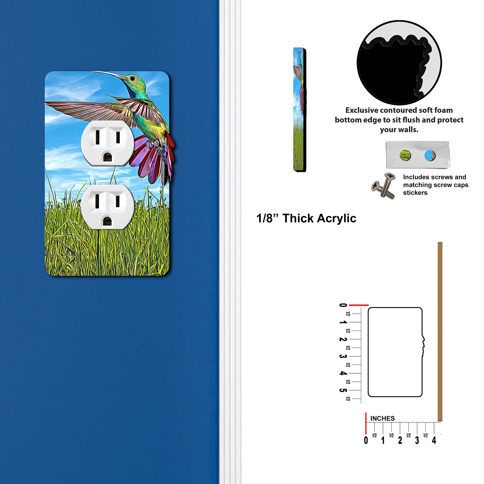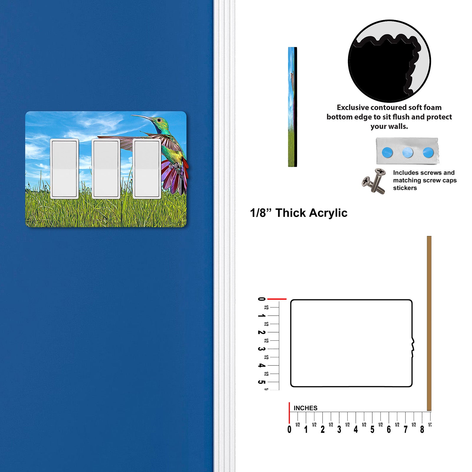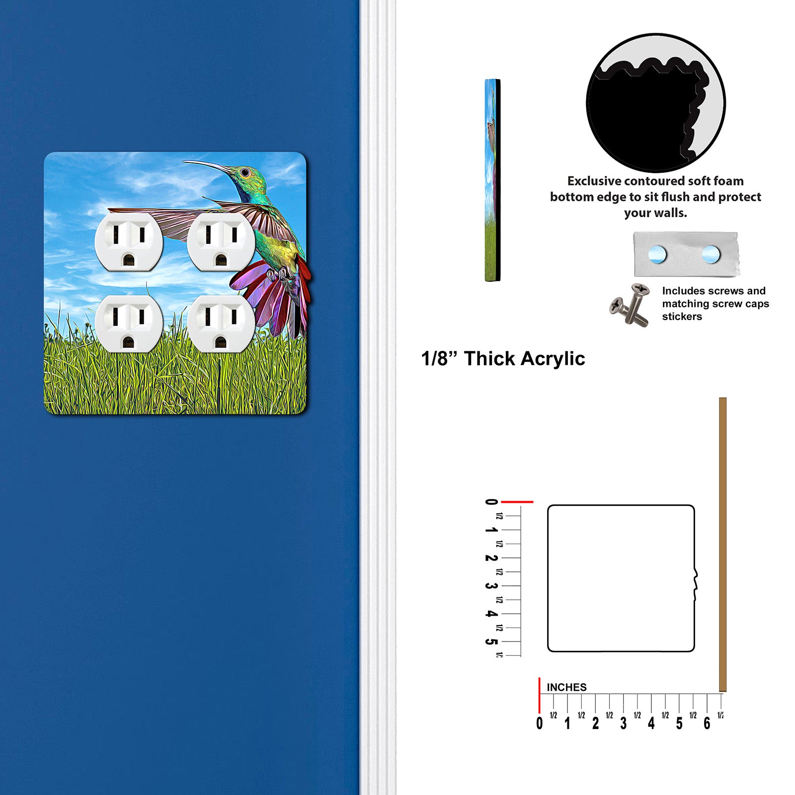 OFF THE WALL PLATES are available for standard switches, outlets and paddle designs as well as blank covers in single, double and triple gang styles (# of switch/outlet slots). Each cover is made of 1/8” laser cut acrylic and features an exclusive 3mm soft foam base that sits flush to the wall and helps protect against scratches or damage.
