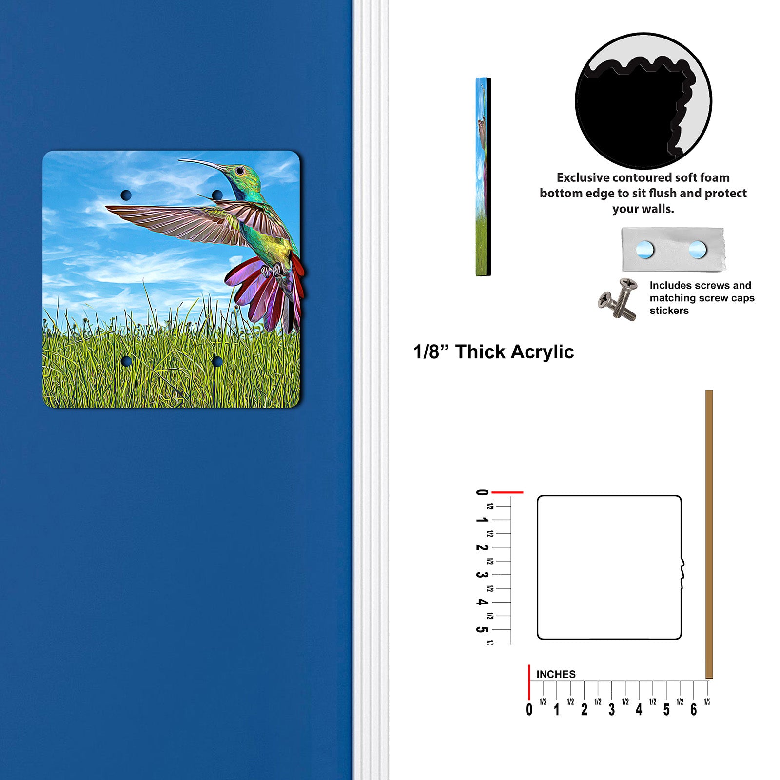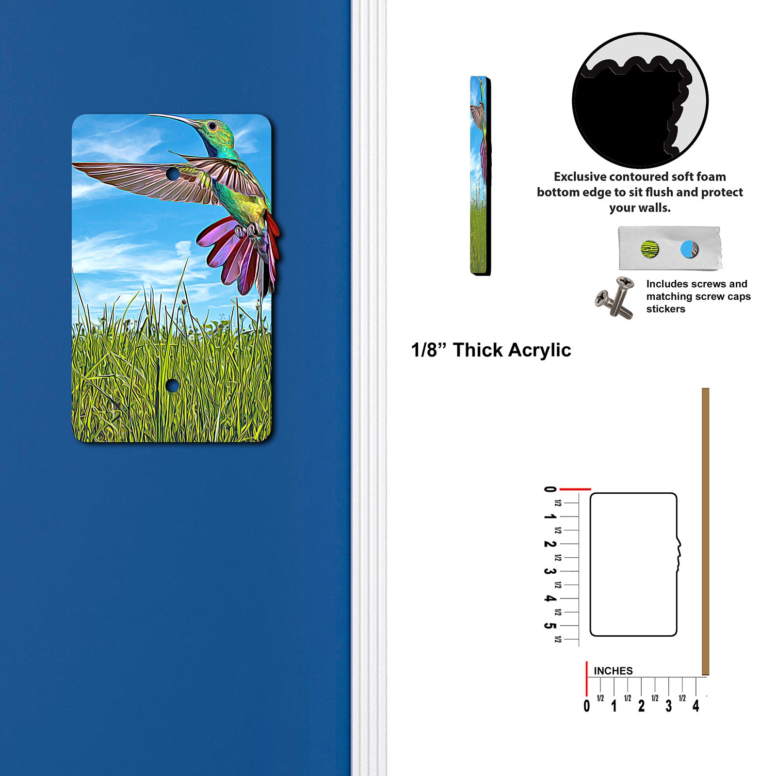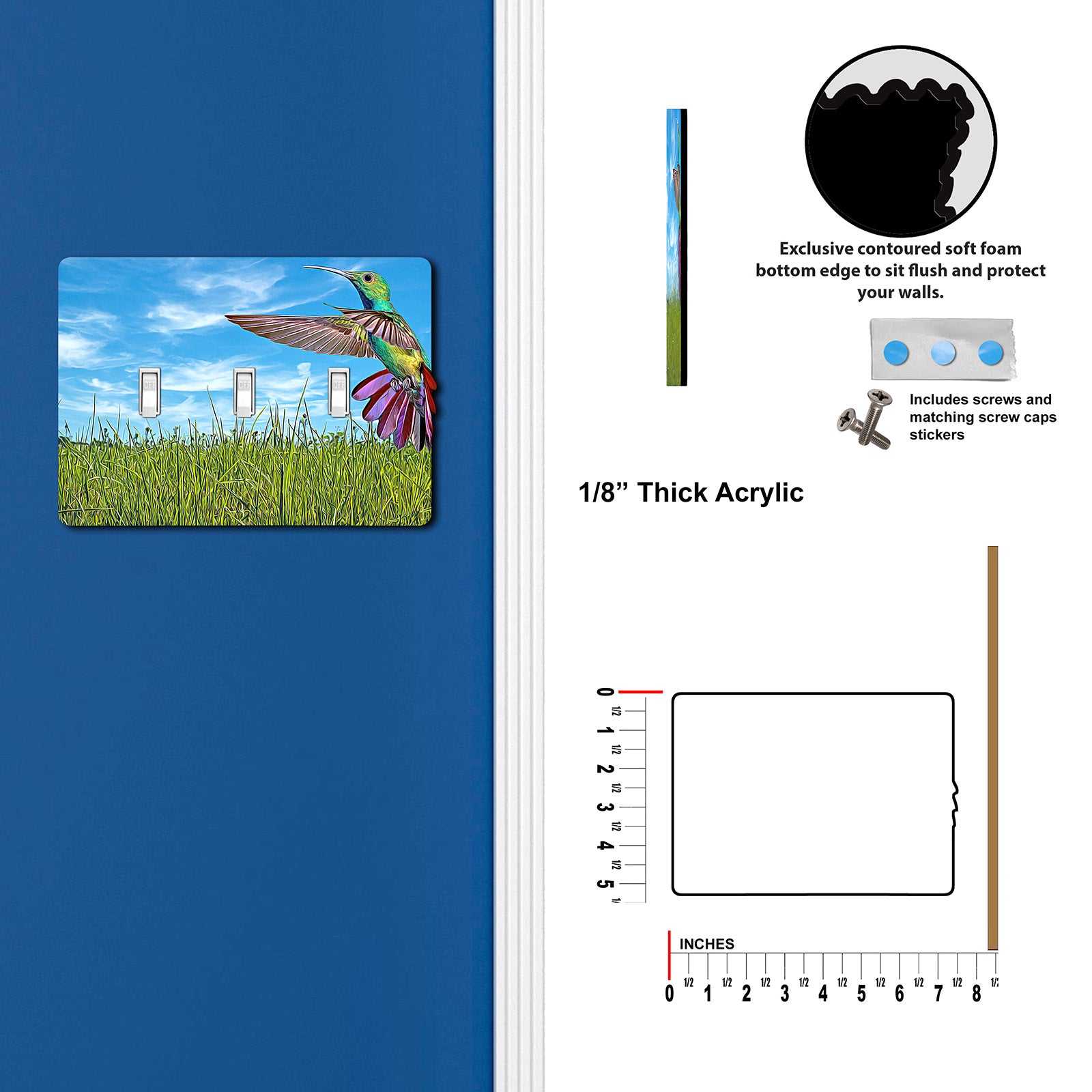 OFF THE WALL PLATES are available for standard switches, outlets and paddle designs as well as blank covers in single, double and triple gang styles (# of switch/outlet slots). Each cover is made of 1/8” laser cut acrylic and features an exclusive 3mm soft foam base that sits flush to the wall and helps protect against scratches or damage.