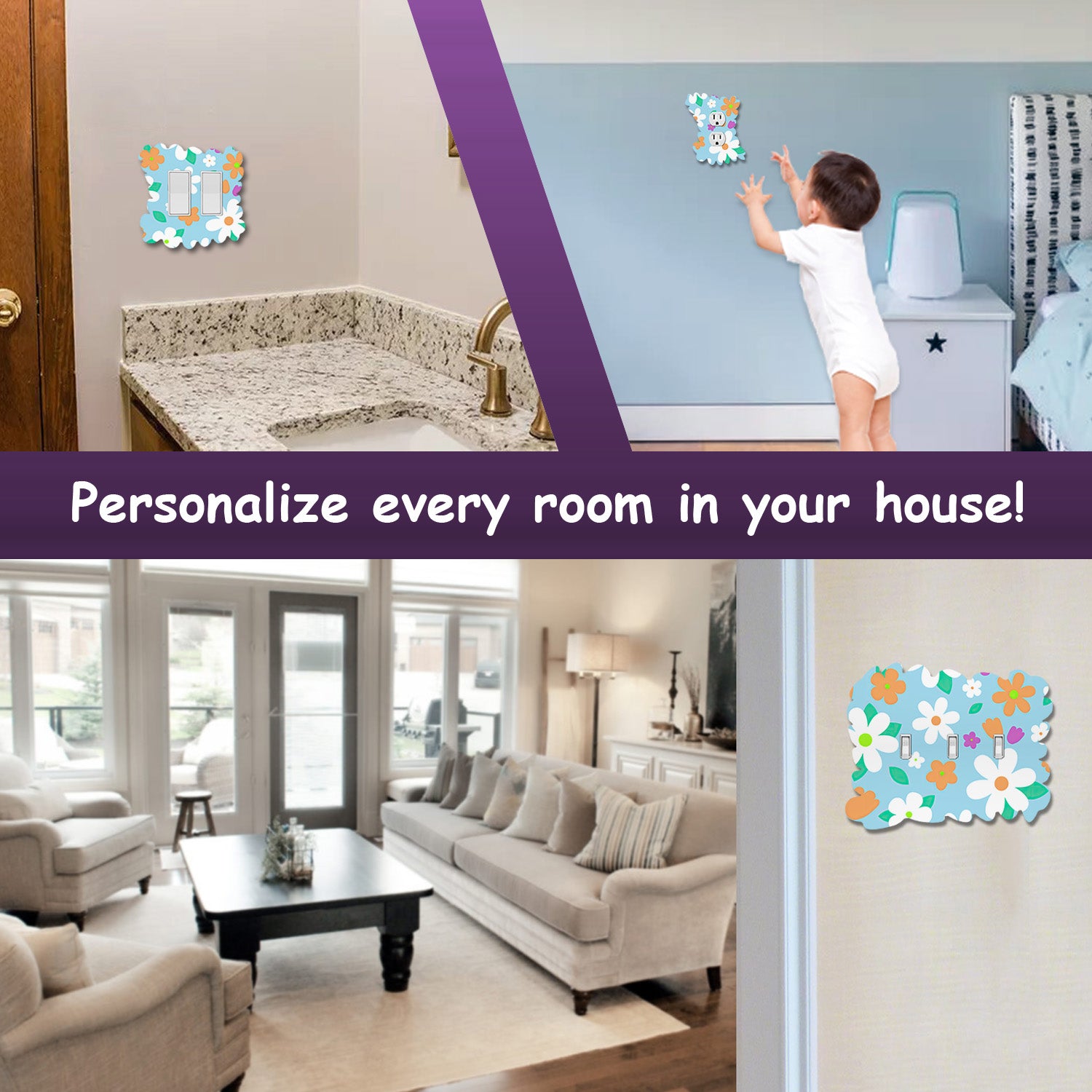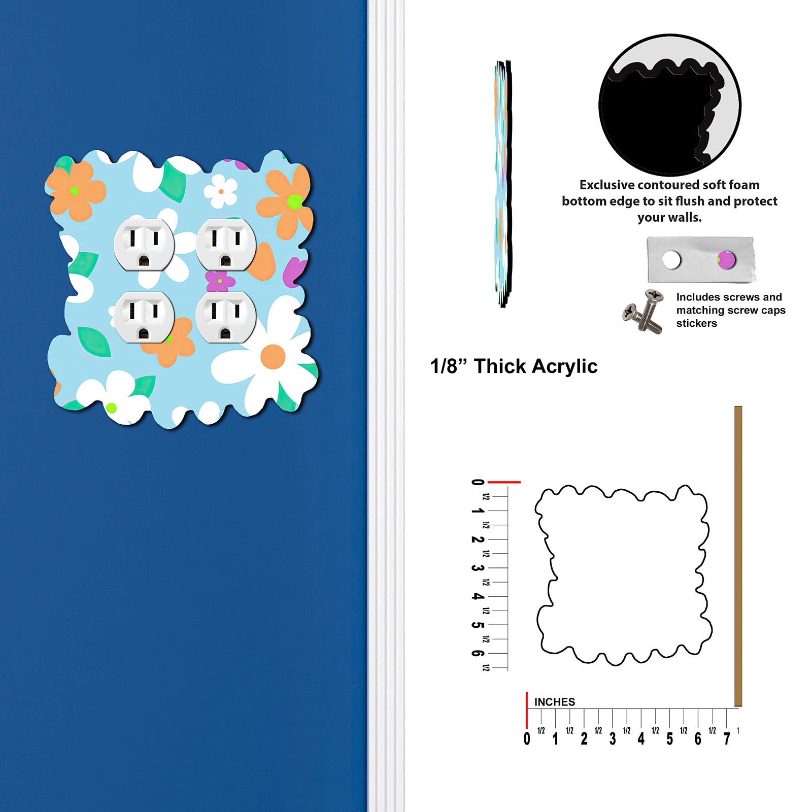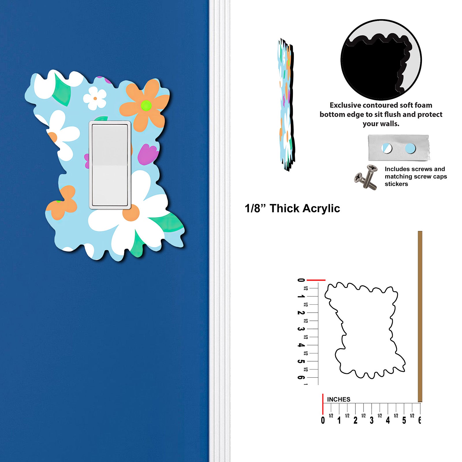 OFF THE WALL PLATES are available for standard switches, outlets and paddle designs as well as blank covers in single, double and triple gang styles (# of switch/outlet slots). Each cover is made of 1/8” laser cut acrylic and features an exclusive 3mm soft foam base that sits flush to the wall and helps protect against scratches or damage.